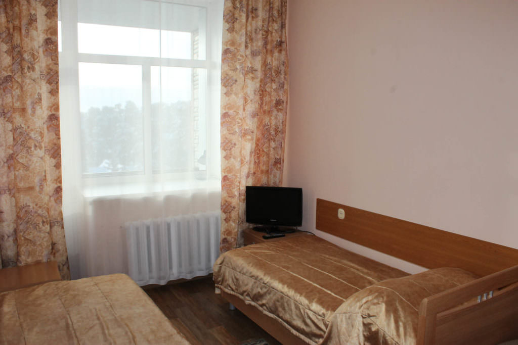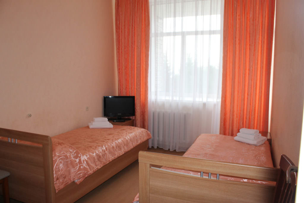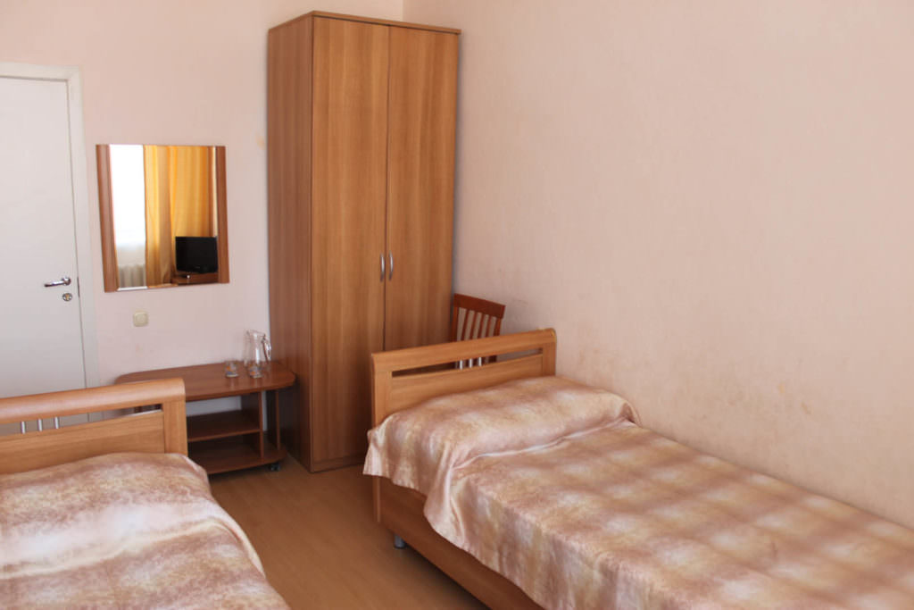 2 осн. места. Мебель: кровати односпальные, прикроватные тумбочки, столик журнальный, стулья, шкаф. Оборудование: телевизор, холодильник (общий на 2 комнаты в блок-секции). Санузел на блок. Сервис: Wi-Fi бесплатно, смена полотенец, смена постельного белья, уборка номера.