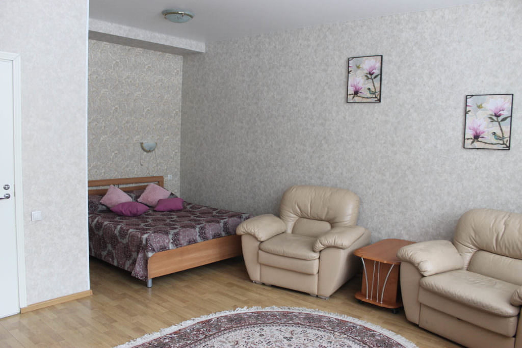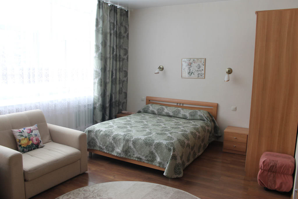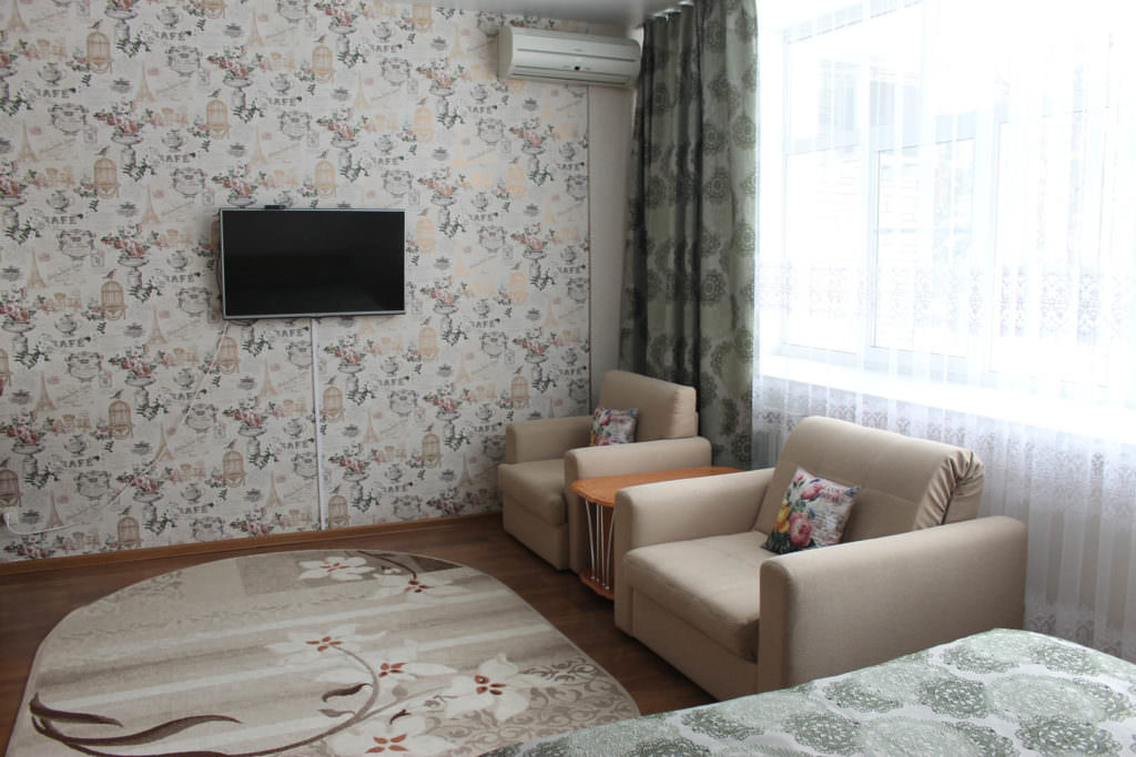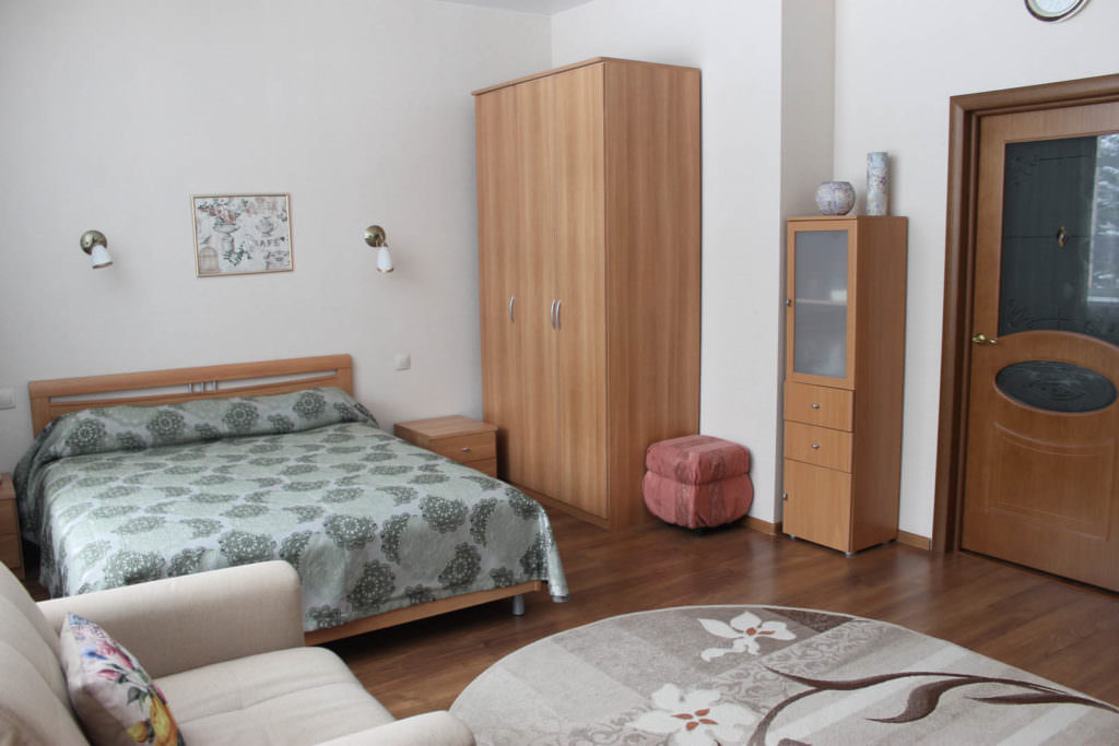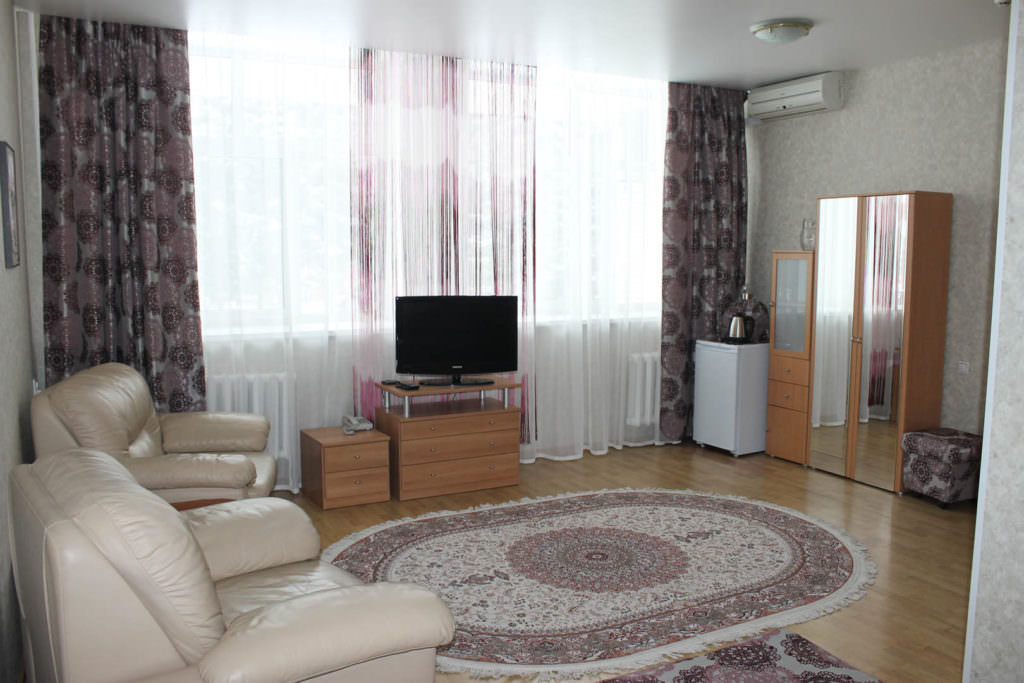 2 осн. места. 1 доп. место. Мебель: диван (или 2 кресла), кровать двуспальная, прикроватные тумбочки, столик журнальный, столик туалетный, шкаф. Оборудование: гладильная доска, кондиционер, набор посуды, телевизор, телефон, утюг, холодильник, электрочайник. Санузел: с ванной/душем, туалетные принадлежности, фен, халат. Сервис: Wi-Fi бесплатно, смена полотенец, смена постельного белья, уборка номера.